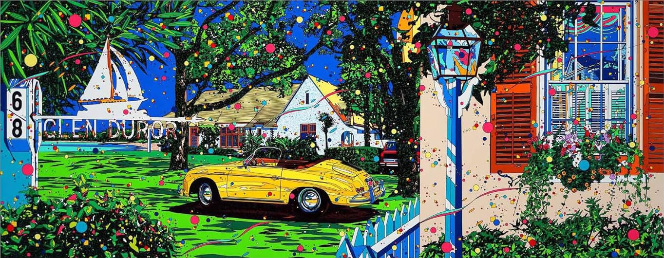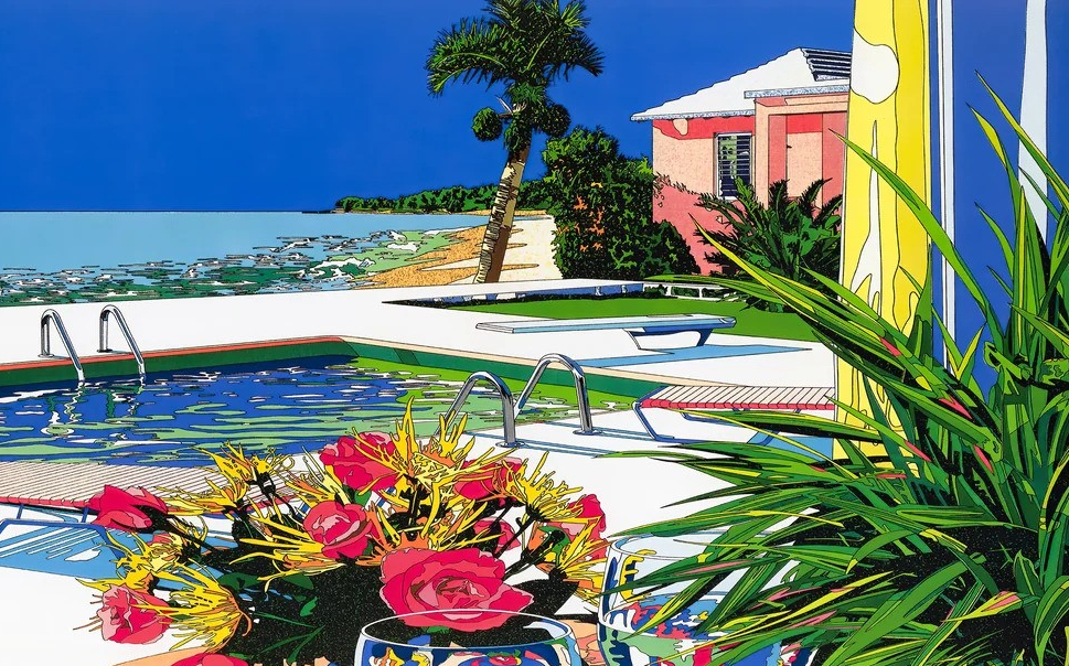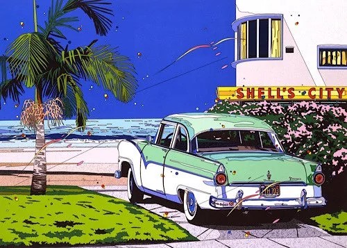 Eizin Suzuki is a Japanese printmaker known for his bright lithographs and silkscreens. Not totally unlike Hiroshi Nagai, Suzuki has a distinct and vibrant style defined by his use of color, bold lines, flat planes, and exotic locales. According to Ronin Gallery, for which he is an artist, “Eizen Suzuki began his career in advertising design, working as both a designer and art director before his debut as an illustrator in 1980. His illustration ranges from album covers to magazines”. Speaking of album covers, I spoke on Hiroshi Nagai being synonymous with the Japanese music genre of City Pop, but I didn’t mention that he was only one of the big three who crafted and popularized the City Pop aesthetic. The big three that are largely responsible for the visual cues associated with that genre are Hiroshi Nagai, Eizen Suzuki, and Hisao Kawada (another artist I’ll be covering in a later Aesthetic Appreciation entry). I’m a fan of each of these artists, and while they’re undoubtedly connected, artistically and thematically, each of them brings something unique to the table.